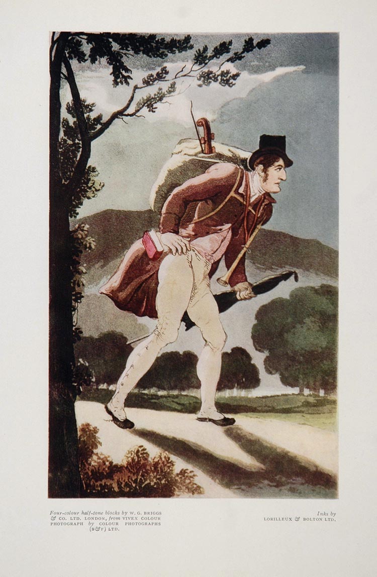 This appears to be an image of an itinerant musician, walking down a road with his violin on his back. Four color half-tone blocks by W. G. Briggs & Co., Ltd. London from Vivex color photograph by Colour Photographs, Ltd. Inks by Lorilleux & Bolton, Ltd.