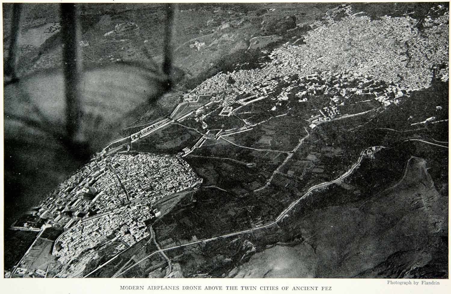 This is an original 1935 black and white halftone print of ancient Fez which consists of Djedid, La Ville Nouvelle and El Bali in Morocco. MDA2