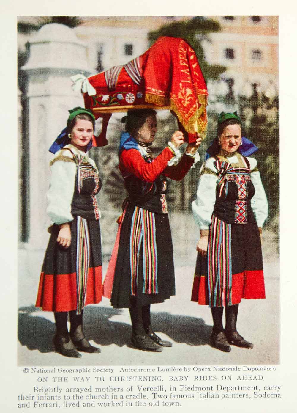 This is an original 1935 color halftone print of a baby riding on the way to it's christening in Vercelli, Italy.