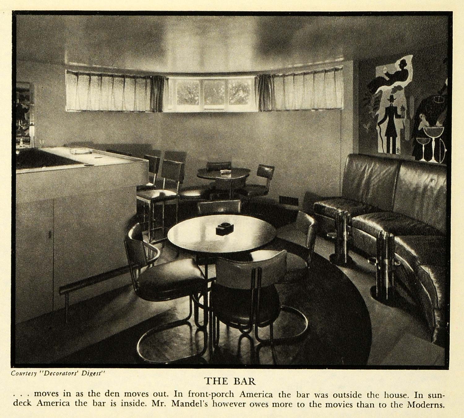 This is an original 1935 halftone print of Richard Mandel's home in Mount Kisco, New York. Mount Kisco is a village located in Westchester County, and was established in 1875. The caption writes, "The bar moves in as the den moves out. In front-porch America the bar was outside the house. In sundeck America the bar is inside..." Photography by Aikins.