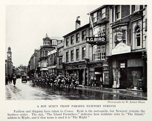 This is an original 1935 black and white halftone print of a boy scout troop parading the Newport streets in Cowes, England.