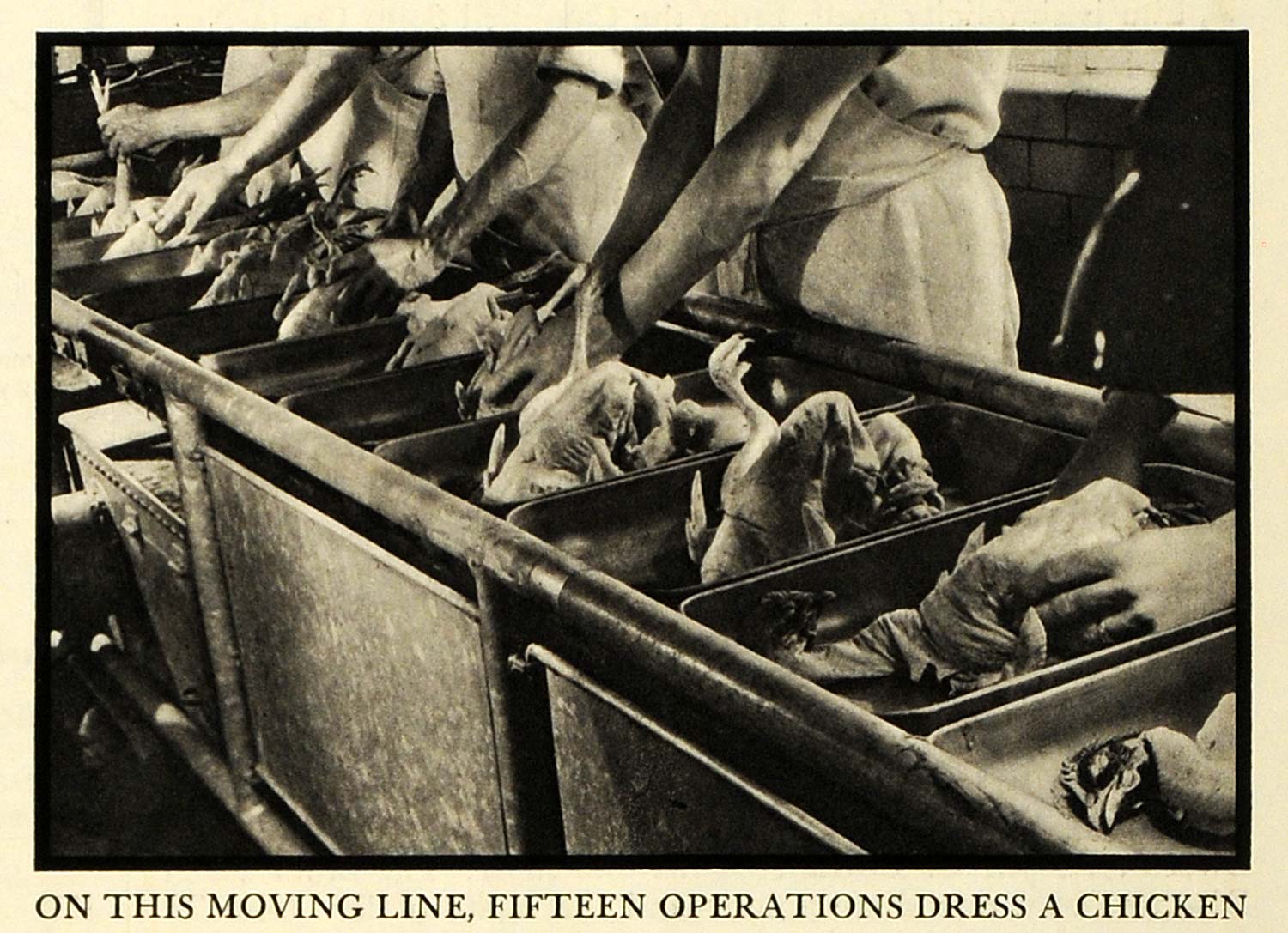 This is an original 1935 halftone print of workers dressing chickens at the Campbell Soup Company in Camden, New Jersey. The caption writes, "On this moving line, fifteen operations dress a chicken." The company was founded in 1869 by Joseph A. Campbell, and currently sells its products in 120 countries.