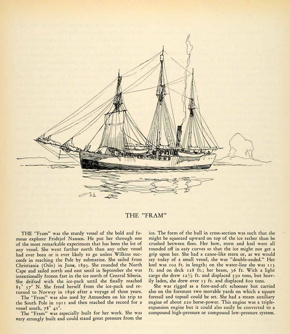This is an original 1935 halftone print of Fram, the three-masted schooner which is said to have gone both further north and further south than any other wooden ship, as it was used by Fridtjof Nansen on expeditions to both the the Arctic and Antarctica. Shipwright Colin Archer designed her specifically to be able to withstand the cold, and the pressure from the ice. As a result, the ship was both very wide and very shallow.