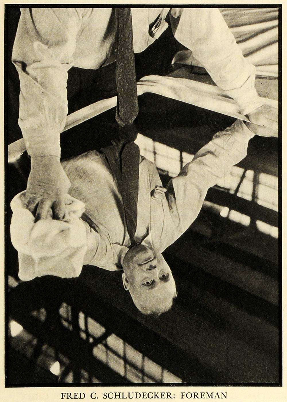 This is an original 1935 halftone print of Fred C. Schludecker, the foreman for Republic Steel. Schludecker used to work for a silver company until it sold a new method for polishing steel. Schludecker's first large project was making steel trimmings for the Chrysler Building in Manhattan, New York. The company was founded in 1899 by Cyrus Eaton, and became the third largest steel producer in America during the 1920s.