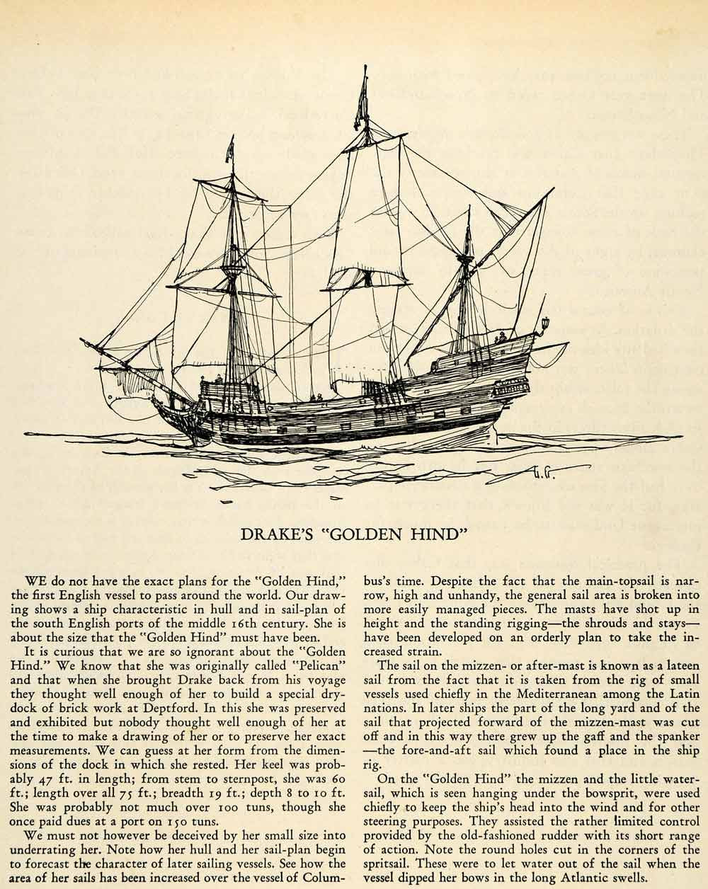 This is an original 1935 halftone print of Sir Francis Drake's ship, "Golden Hind." Originally named "Pelican," the galleon was used to circumnavigate the globe between 1577 and 1580. In addition to its lateen rigging on the mizzenmast, it also has a small water-sail and beakhead under the bowsprit. Galleons developed from carracks, hence the lowering of the forecastle.
