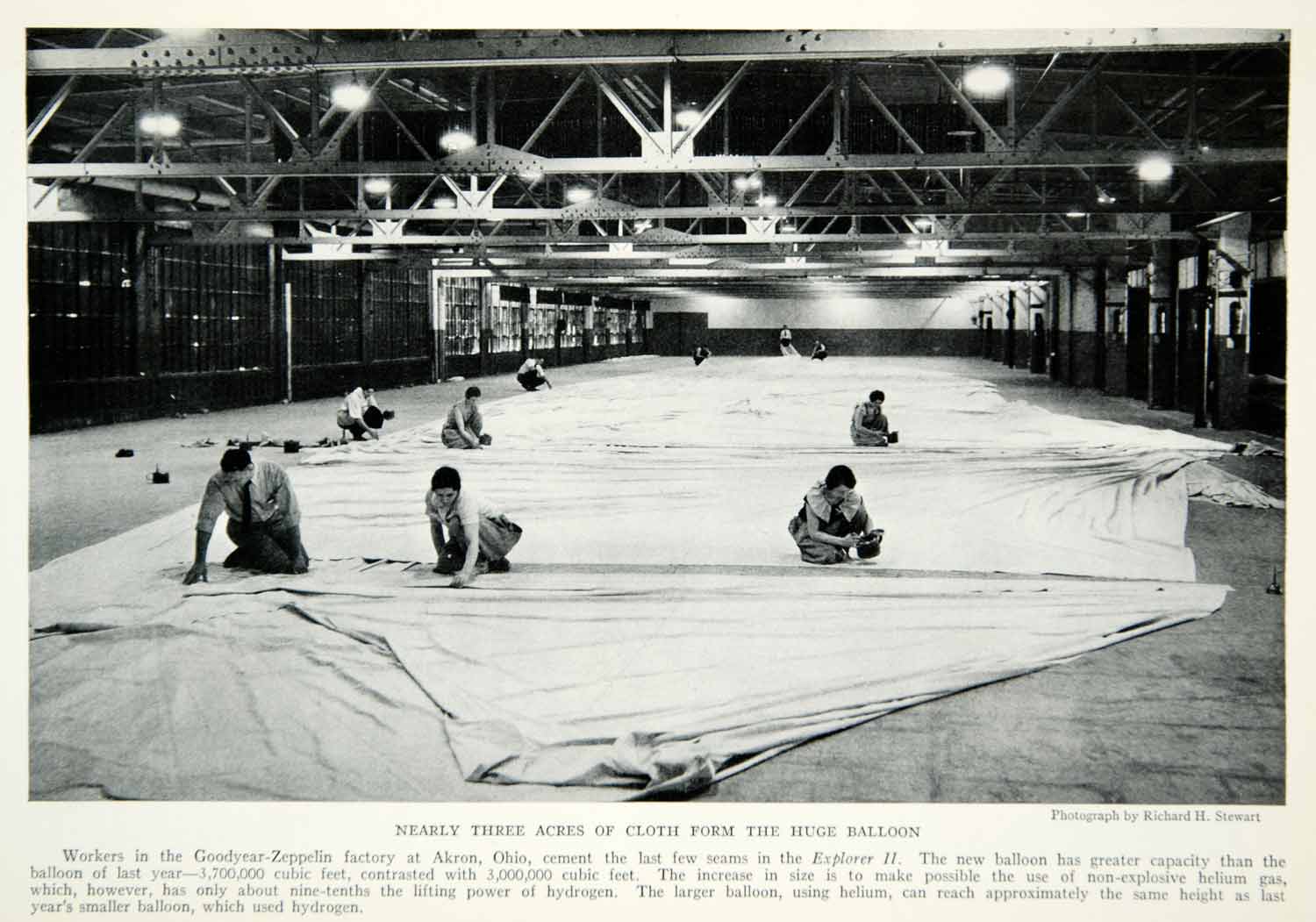 This is an original 1935 black and white halftone print of workers in the Goodyear-Zepplin factory in Akron, Ohio cementing the last few seams in the