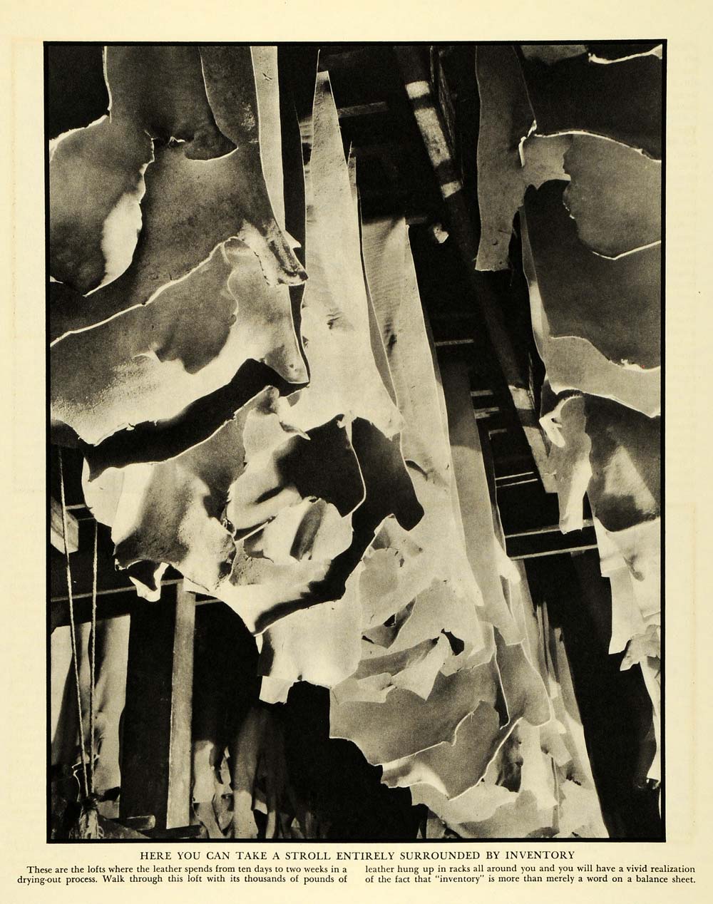 This is an original 1935 halftone print of hanging leather hides at a tannery. The caption writes, "These are the lofts where the leather spends from ten days to two weeks in a drying-out process. Walk through this loft with its thousands of pounds of leather hung up in racks all around you and you will have a vivid realization of the fact that 'inventory' is more than merely a word on a balance sheet."