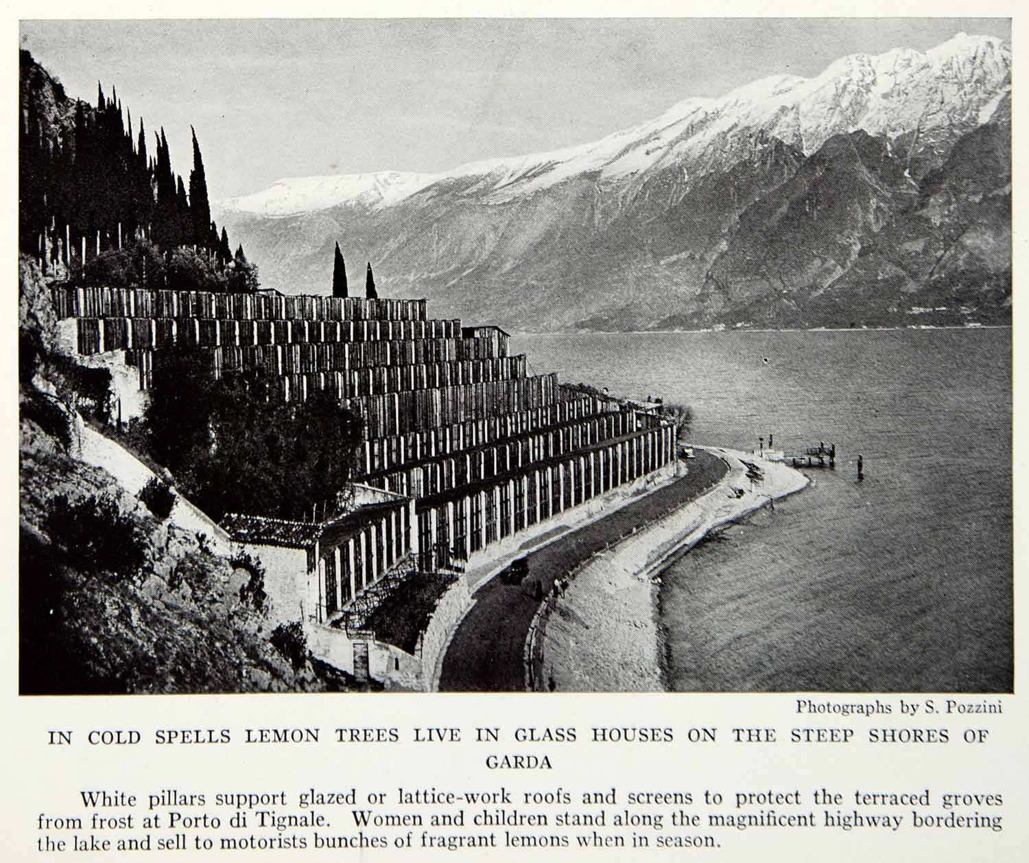 This is an original 1935 black and white halftone print of lemon trees in glass houses when the weather is cold in Porto di Tignale, Italy,