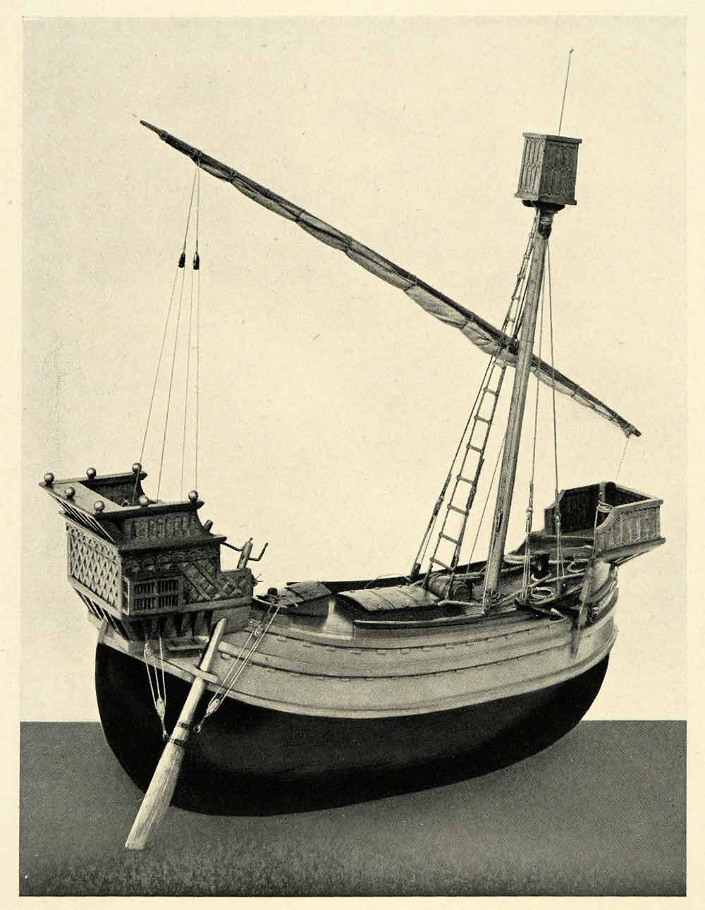 This is an original 1935 halftone print of of a model Mediterranean ship from about the fourteenth century. The model is located in the Science Museum in South Kensington.