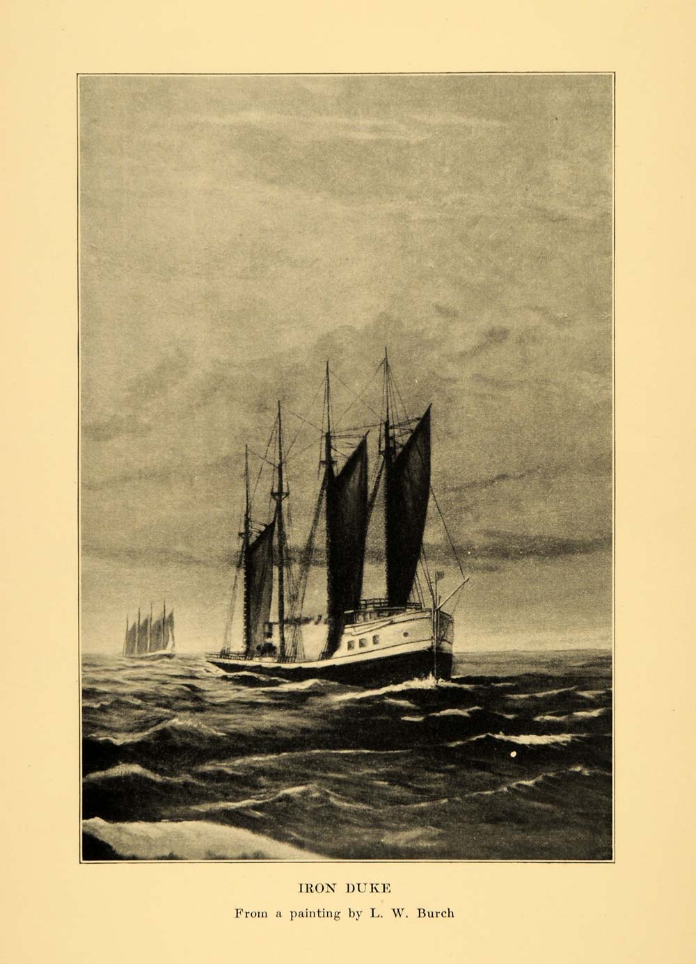 This is an original 1935 halftone print featuring a painting of Iron Duke, one of the three ships of the British Royal Navy, from a painting by L. W. Burch.