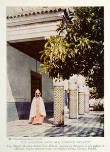 This is an original 1935 color halftone print of Serif Moulay-Kebir Ben Zidane posing in the patio of his palace in Meknès.