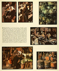 This is an original 1935 color print of pushcarters in New York City. The caption writes, "Pushcarting is an old man's business. Though it means standing for long hours on hard pavements, many pushcard vendors are over sixty, most are over forty-five-- even women, who are often wives helping out..."