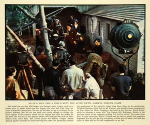 This is an original 1935 color print on the set of Shirley Temple's "The Littlest Rebel." The caption writes, "Darryl Zanuck guards carefully his chief surviving Fox asset. He personally oversees the production of her [Temple's] pictures, rather than leave them (as his predecessor Winfield Sheehan, often did) to Sol Wurtzel, who handles minor productions on Fox's other lot..." Temple is seen here holding the hand of her director, David Butler. Next to butler is tap dancer, Bill Robinson.