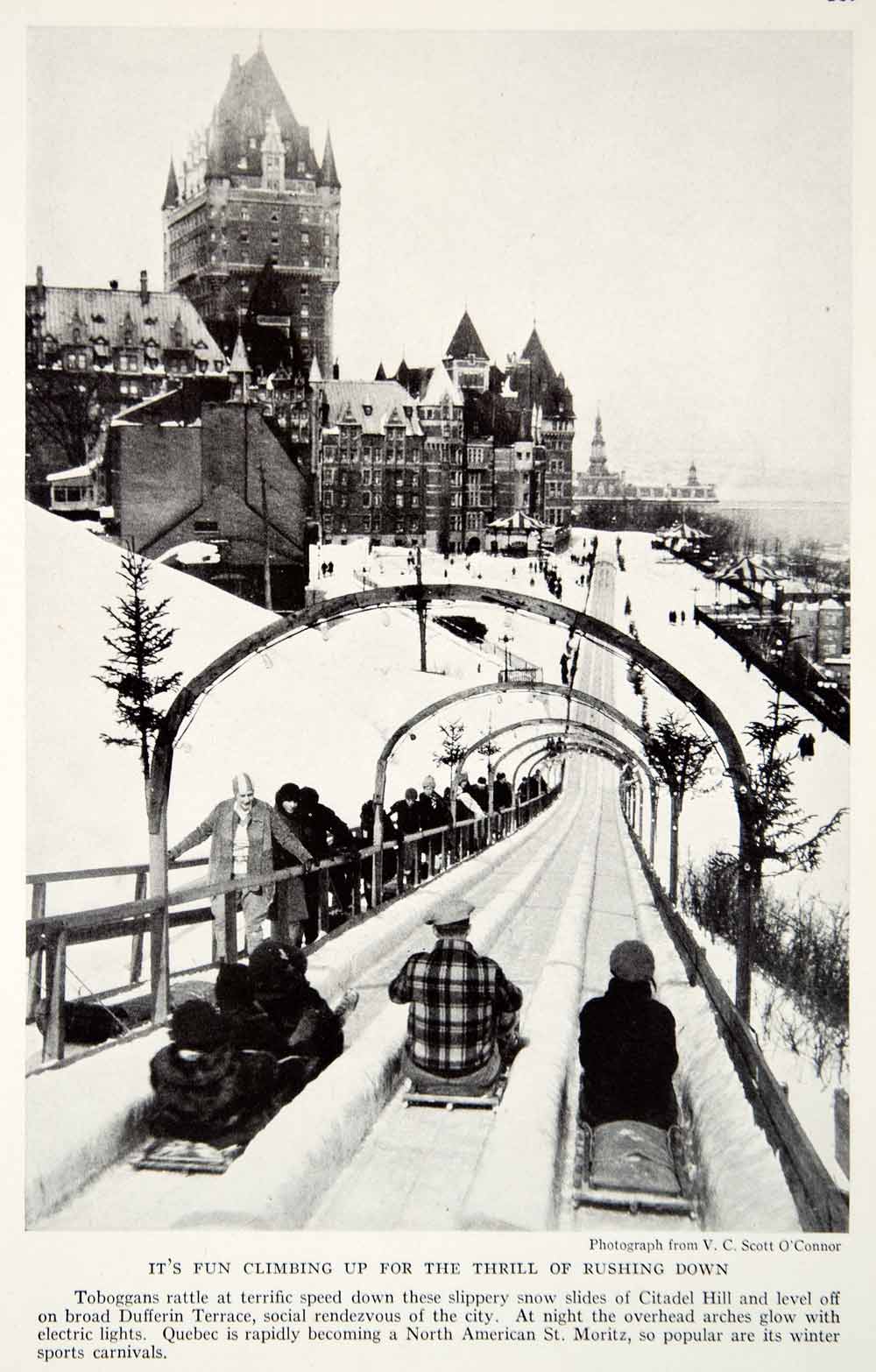 This is an original 1935 black and white halftone print of toboggans racing down Citadel Hill to level off on Dufferin Terrace in Quebec, Canada.