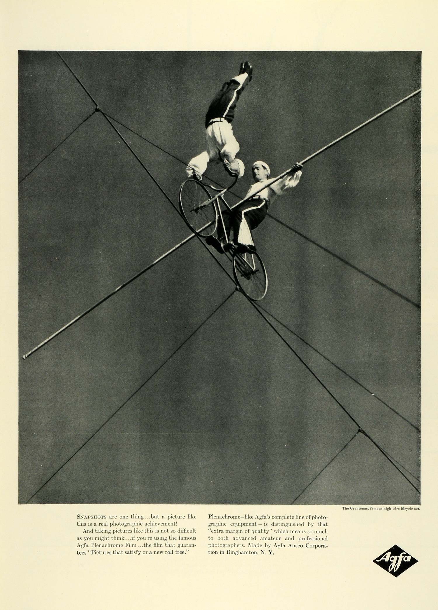 This is an original 1936 black and white print ad for Agfa Plenachrome Film, a product by the Agfa Ansco Corporation of Binghamton, New York. This ad specially features the Grentonas' famous high-wire bicycle stunt.
