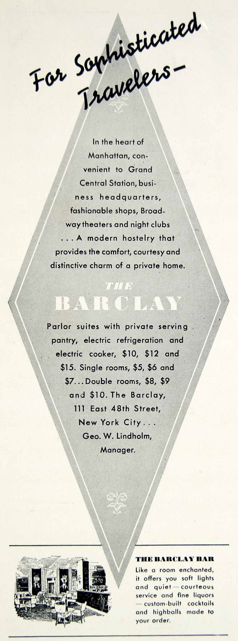 This is an original 1936 black and white print ad for the Barclay in Manhattan, New York.