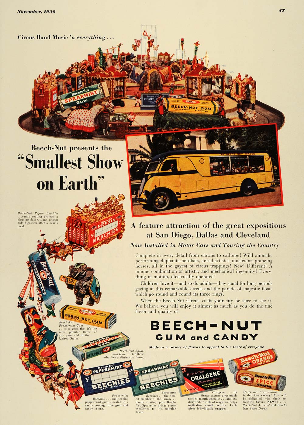 Keywords specific to this image: Spearmint, Oralgene, Spice Drops, Elephants, Smallest Show on Earth, San Diego, Dallas, Cleveland Vintage Advertising