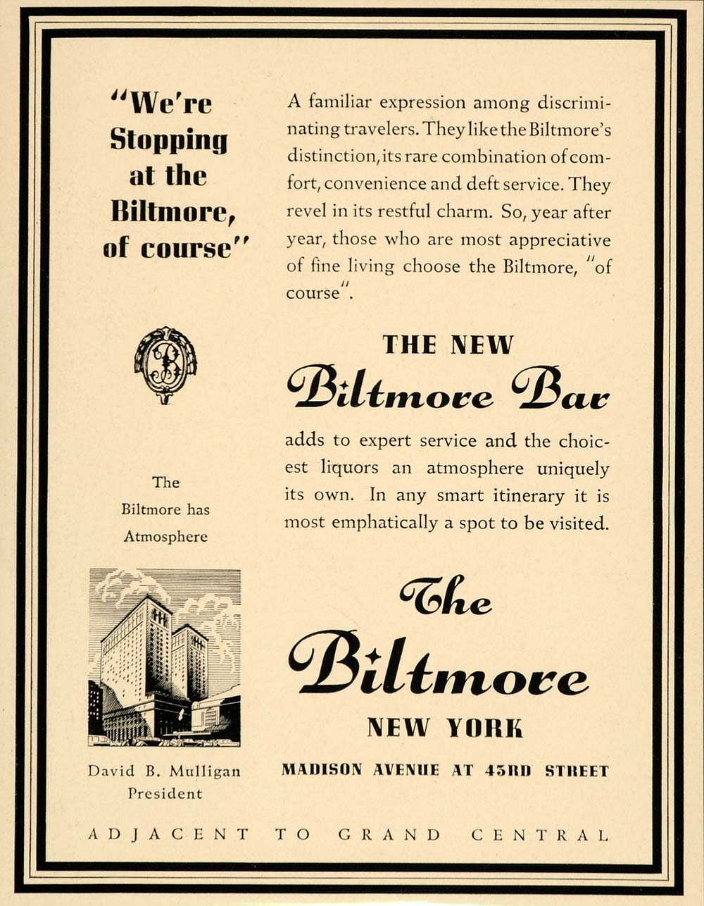 This is an original 1936 black and white print ad for the new Biltmore Bar located in The Biltmore Hotel in New York.