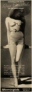 This is an original 1936 black and white print ad for Bloomingdale's Department Store, located at Lexington at 59th Street in New York. This ad features their Bare Essentials Satin Lastex Maillots and Swimsuits.
