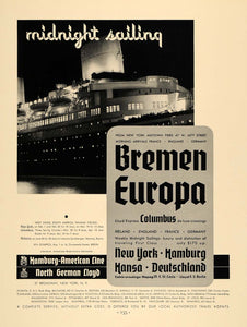 This is an original 1936 black and white print ad for Cruise Lines from Bremen Europa located in New York, New York. They go to their four main ports in New York, Hamburg, Hansa, and Deutschland on the Hamburg-American Line and the North German Lloyd.