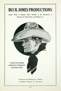 This is an original 1936 black and white print ad for Buck Jones Productions with a nice portrait of the famous western picture star, Buck Jones (1891-1942). Born Charles Frederick Gebhart, Charles "Buck" Jones, with his horse Silver, was one of the most popular of the cowboy stars of B Westerns in the 20's and 30's. Some of his movies include: The Last Straw (1920), Desert Valley (1926), Whispering Sage (1927), The Lone Rider (1930), The Texas Ranger (1931), The California Trail (1933), Overland Express (1938), and Dawn on the Great Divide (1942). He died in the tragic Coconut Grove nightclub fire in Boston in 1942.