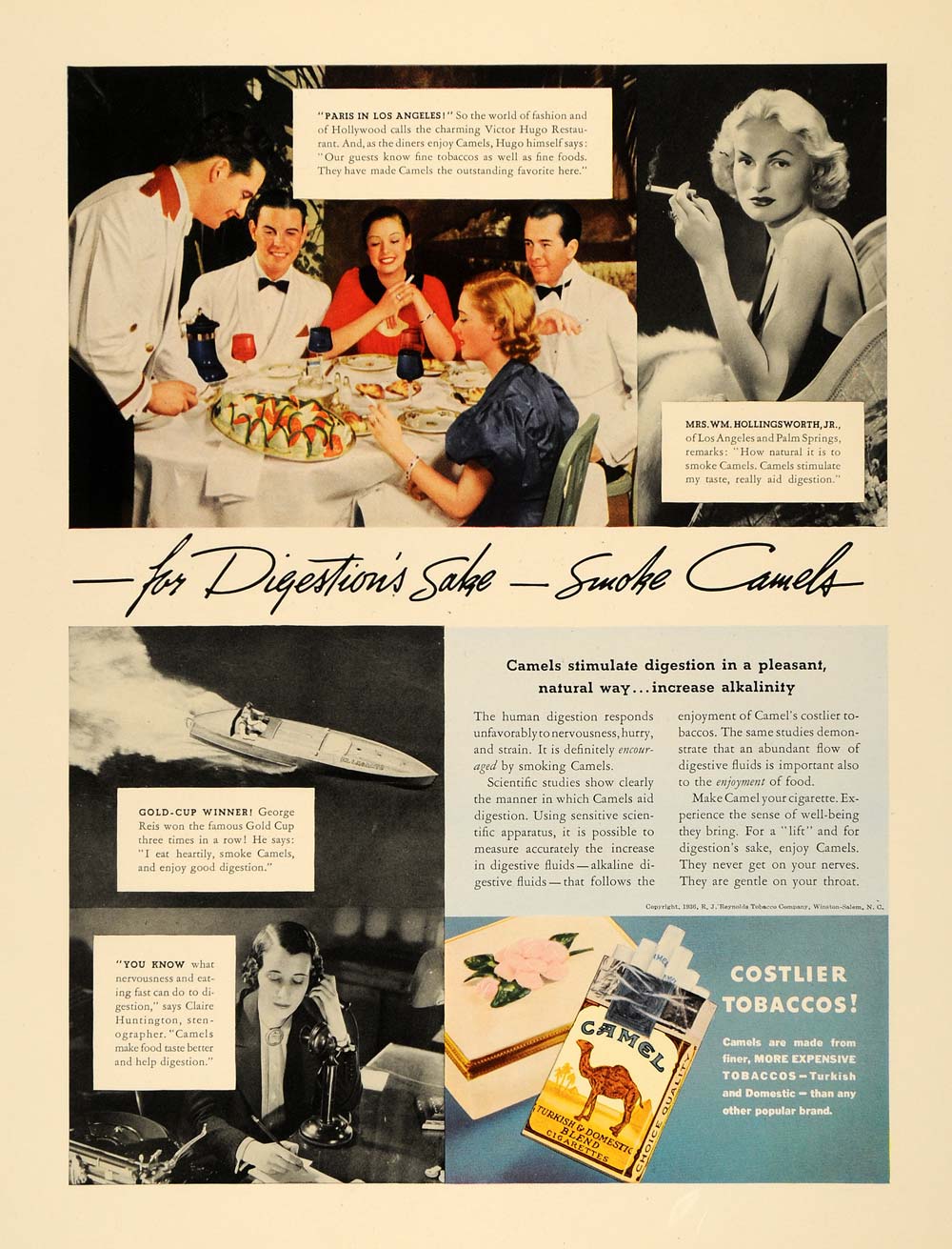 This is an original 1936 color print ad for Camel Cigarettes from R. J. Reynolds Tobacco. This ad explains how cigarettes are vital for proper digestion. With quotes from supposed Camel smokers, George Reis, Clair Huntington, and Mrs. WM. Hollingsworth Jr.