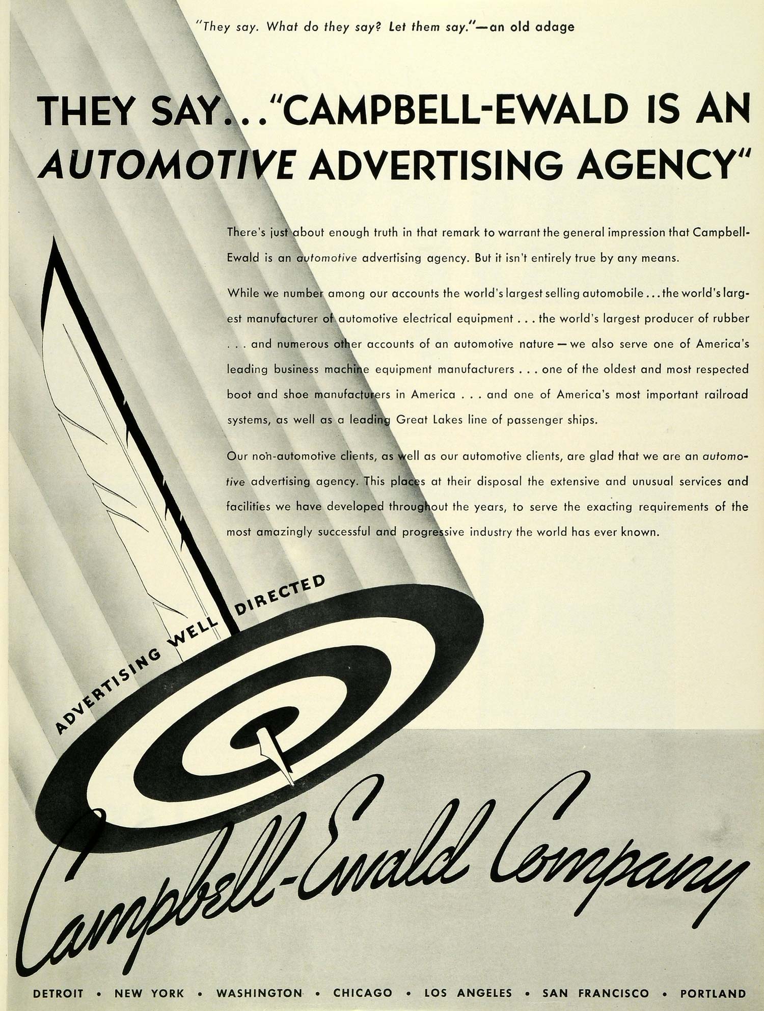 This is an original 1936 black and white print ad for the Campbell-Ewald Automotive Advertising Agency.