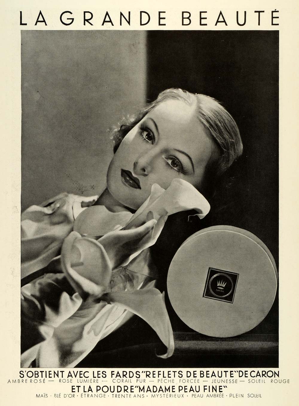 This is an original 1936 black and white French print ad for Caron "Reflections of Beauty" facial products and powders from France.