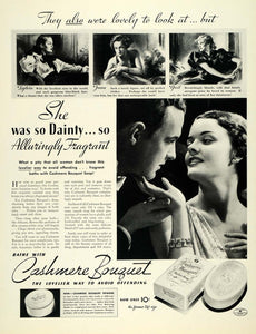 This is an original 1936 black and white print ad for Cashmere Bouquet Soap and Facial Powder.