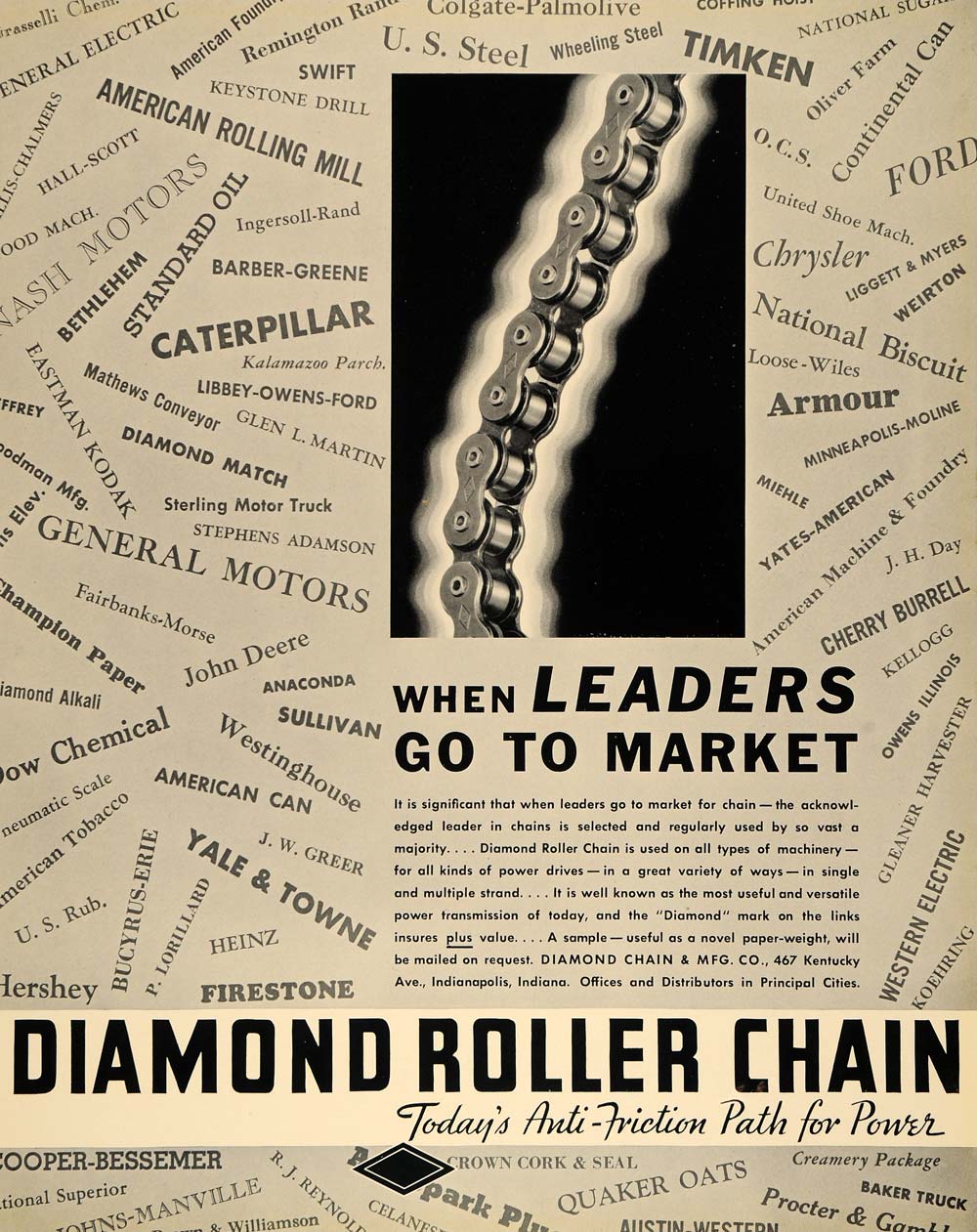 This is an original 1936 black and white print ad for the companies who use Diamond Roller Chains from the Diamond Chain and MFG. Co. located in Kentucky. This ad uses the names of many companies including Caterpillar, Hershey, and Quaker Oats.
