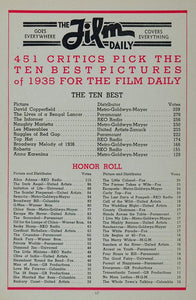 This is an original 1936 two-color print ad from The Film Daily with a list of the ten best pictures of 1935 picked by 451 critics. The films include: "David Copperfield," "The Lives of a Bengal Lancer," "The Informer," "Naughty Marietta," "Les Miserables," "Ruggles of Red Gap," "Top Hat," "Broadway Melody of 1936," "Roberta," and "Anna Karenina."