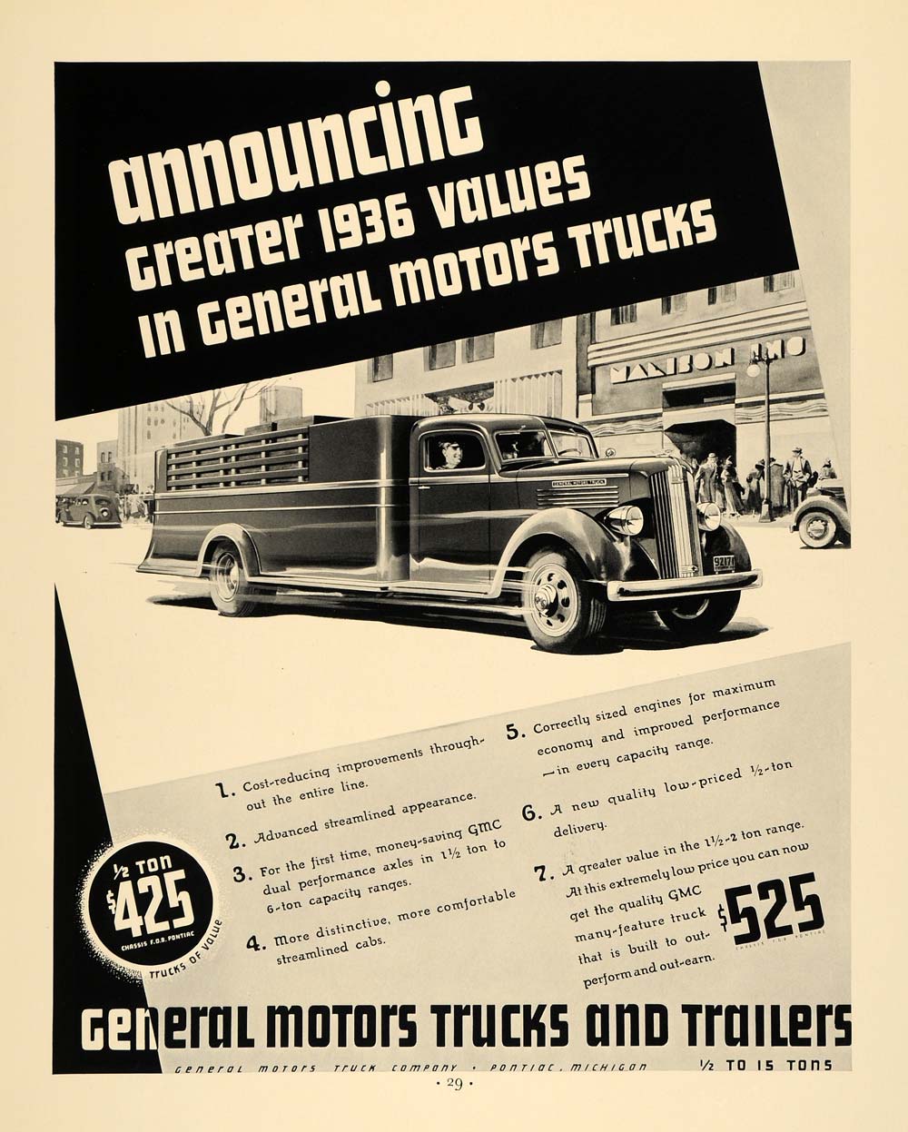 This is an original 1936 black and white print ad promoting the General Motors trucks and trailers from General Motors Truck Company located in Pontiac, Michigan.