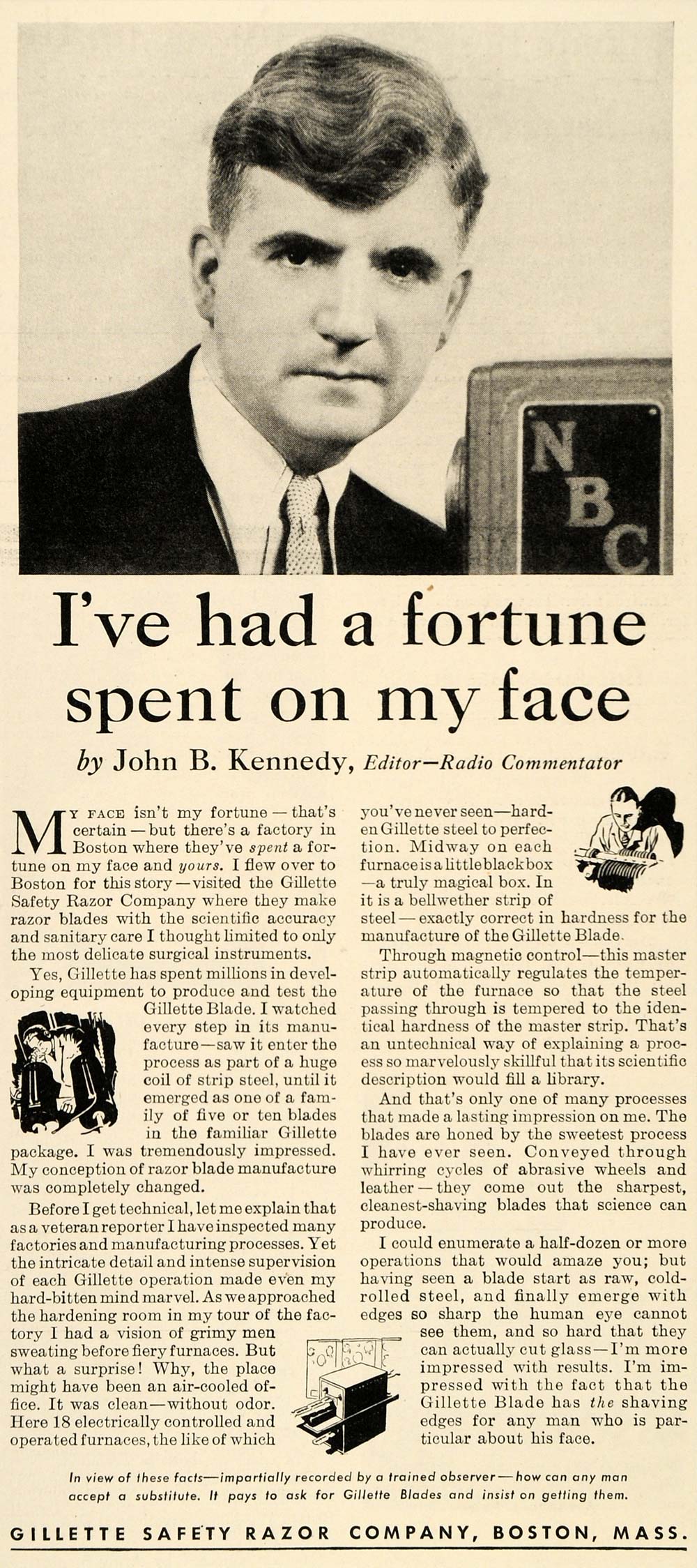 This is an original 1936 black and white print ad for Gillette Razor Blades from the Gillette Safety Razor Company of Boston with a testimonial from John B. Kennedy, editor and NBC radio commentator.