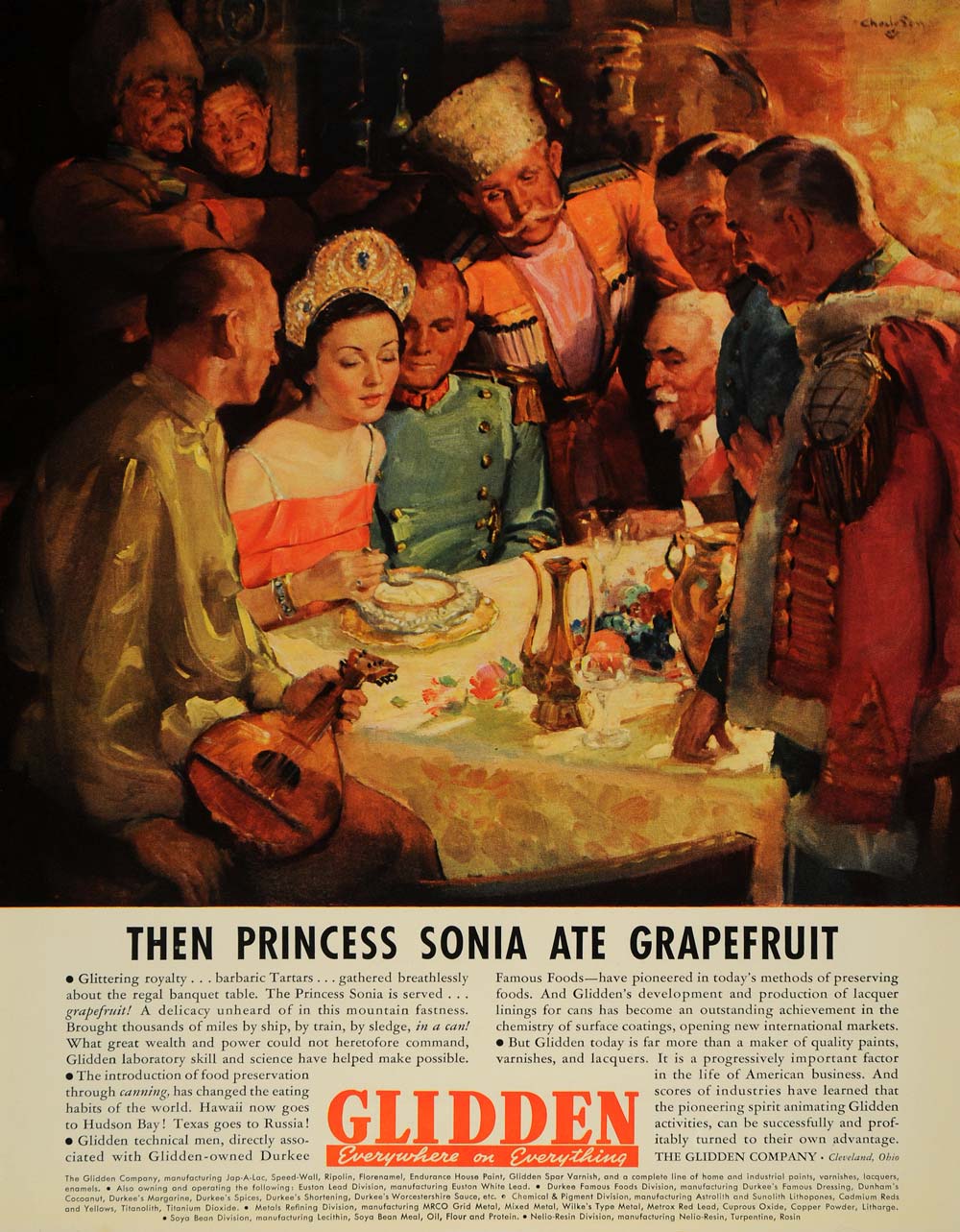 This is an original 1936 color print ad for Glidden Laquer Can Lining from the Glidden Co. located in Cleveland, Ohio. This is a beautiful painting which shows a princess eating canned grapefruit. This new technology of canning is fit for a Princess, so it will be fit for you.