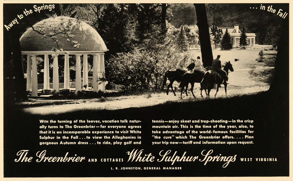 This is an original 1936 black and white print ad for The Greenbrier and Cottages in White Sulphur Springs, West Virginia, under L.R. Johnston management.