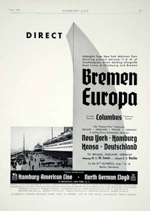 This is an original 1936 black and white print ad for direct passenger service routes between Germany and America that were operated by the Hamburg-American Line and the Norddeustcher Lloyd (North German Lloyd) shipping company of 57 Broadway, New York, NY. The ad also referenced travel packages for the XI Olympic Games in Berlin, Germany that was officially opened by Chancellor and Führer Adolf Hitler.