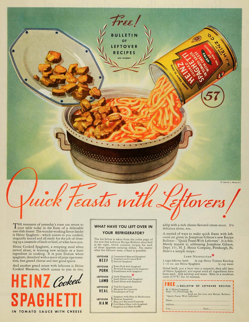 This is an original 1936 color print ad for Heinz Cooked Spaghetti in Tomato Sauce with Cheese, a product by the H. J. Heinz Company in Pittsburgh. This ad features a recipe for Lamb Neapolitan.