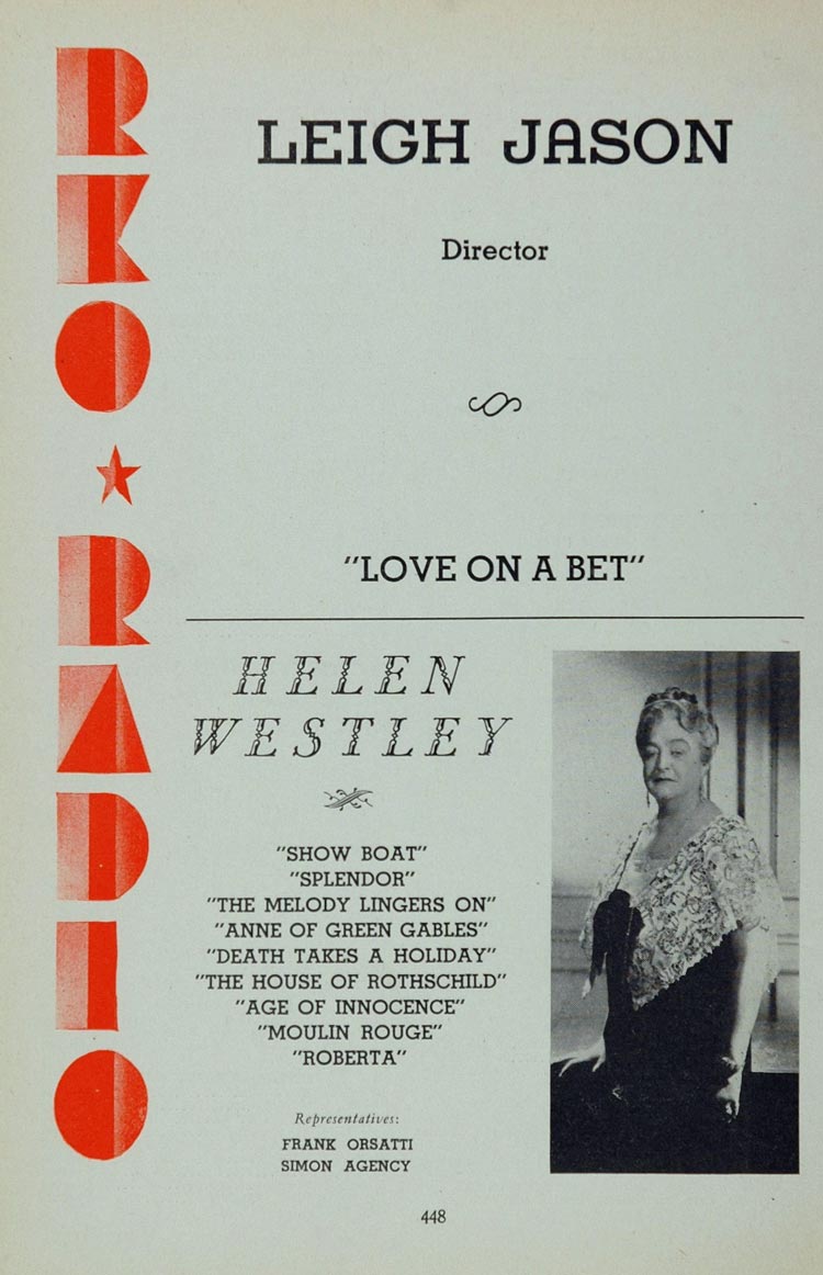This is an original 1936 two-color print ad for RKO Radio Pictures featuring Leigh Jason and Helen Westley. Jason was the director for "Love on a Bet." Westley starred in movies including "Show Boat," "Splendor," "The Melody Lingers On," "Anne of Green Gables," "Death Takes A Holiday," "The House of Rothschild," "Age of Innocence," "Moulin Rouge," and "Roberta."