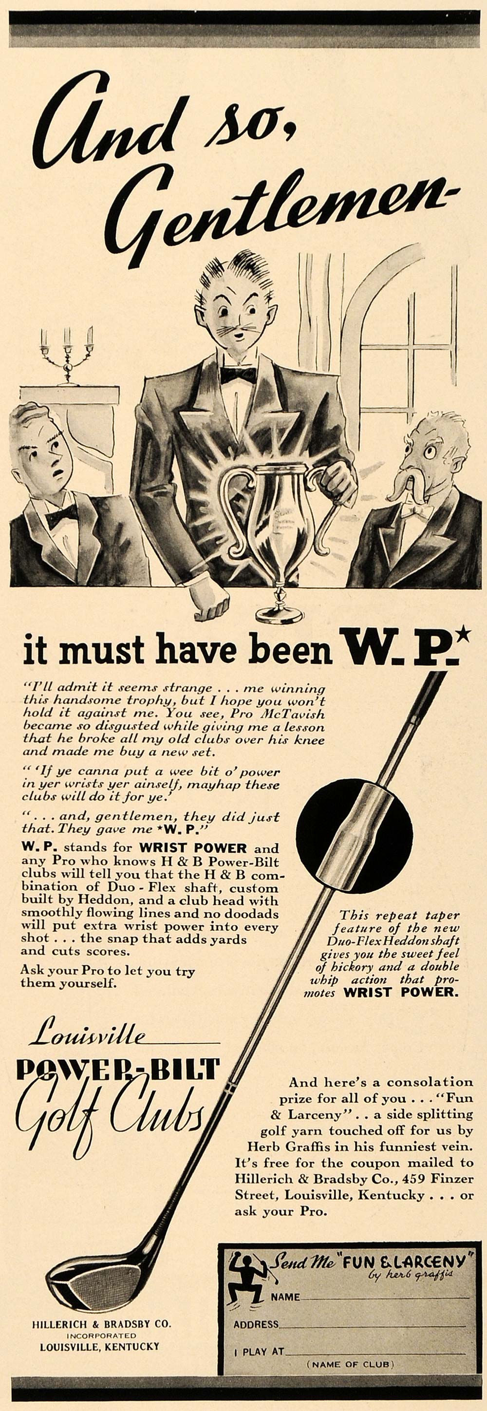 This is an original 1936 black and white print ad for the Hillerich & Bradsby Company, Incorporated, located in Louisville, Kentucky. This ad features their Louisville Power-Bilt Golf Clubs with Wrist Power. This company is located at 459 Finzer Street in Louisville.