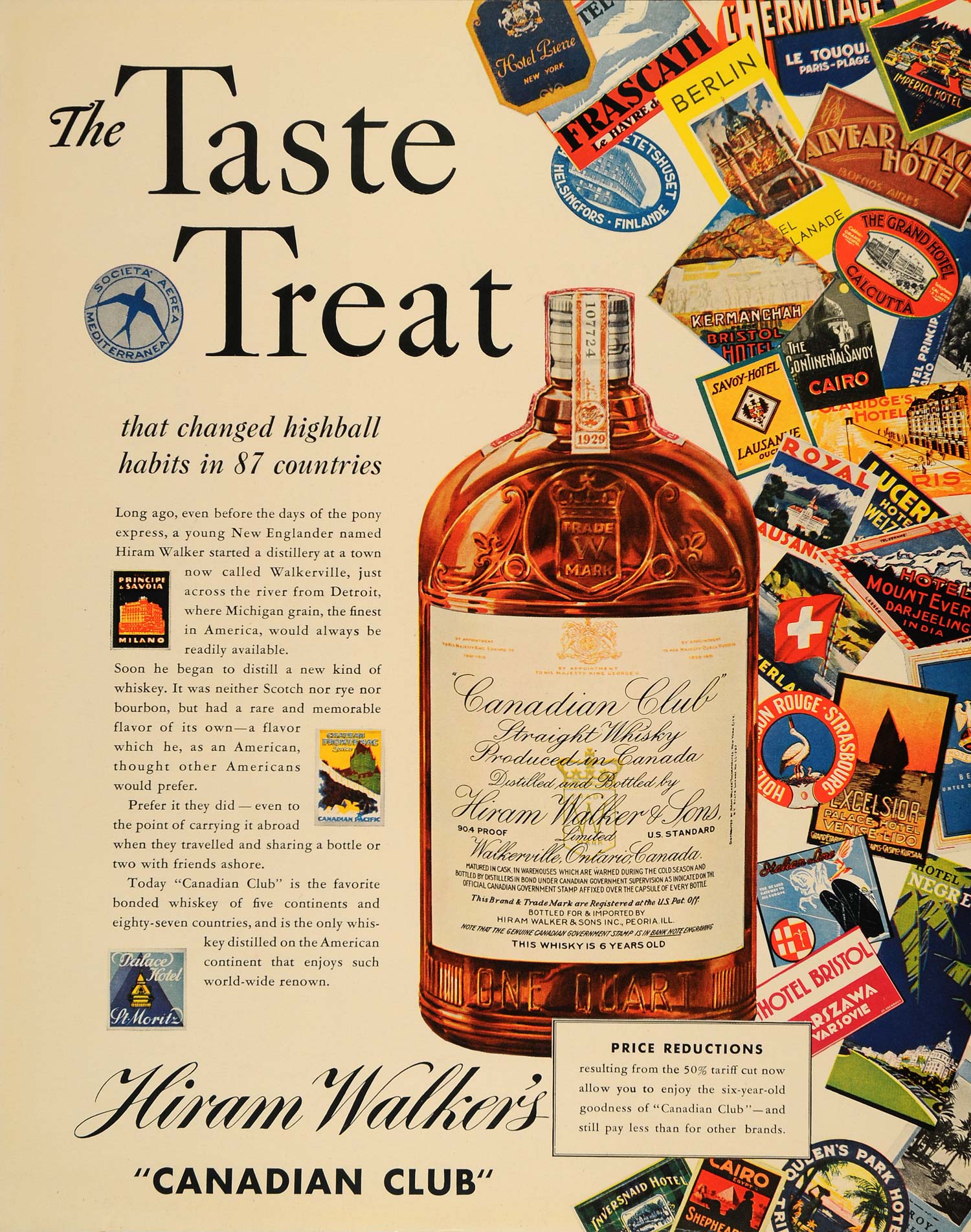 This is an original 1936 color print ad for the Hiram Walker's Canadian Club whisky.