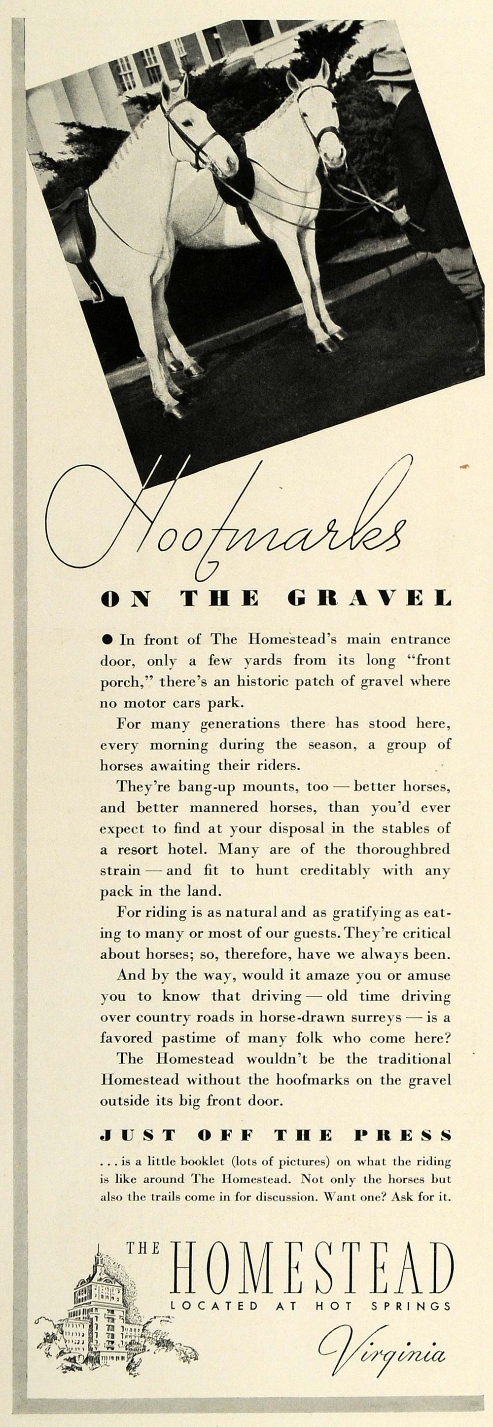 This is an original 1936 black and white print ad for the Homestead Hotel located in Hot Springs, Virginia.