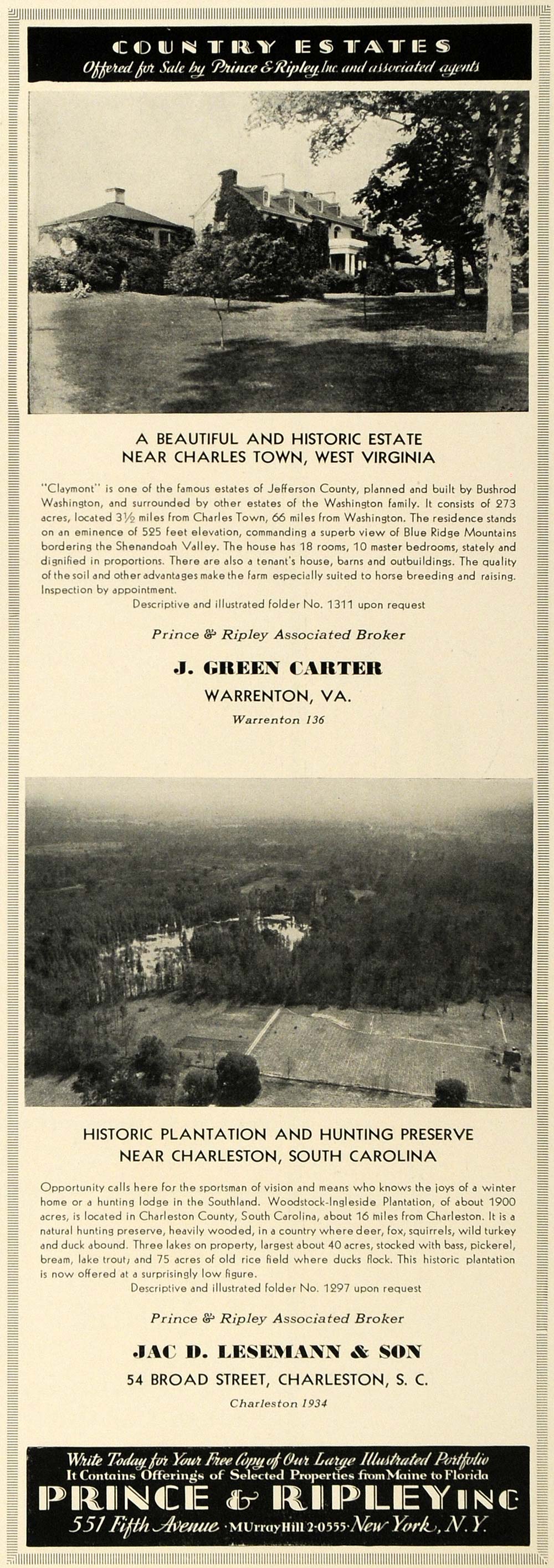 This is a rare original 1936 black and white print ad promoting a house for sale in Claymont, one of the famous states of Jefferson County, from Prince & Ripley Incorporation located on 551 Fifth Avenue, New York. The residence stands on an eminence of 525 feet elevation, commanding a superb view of Blue Ridge Mountains bordering the Shenandoah Valley. The house has 18 rooms, 10 master bedrooms, a tenant's house and barns. Prince & Ripley Associated Broker: J. Green Carter, Warrenton, Virginia.