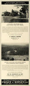 This ad also features an image of the Woodstock-Ingleside Plantation for sale from Prince & Ripley Incorporation. The Woodstock-Ingleside Plantation is about 1900 acres, located in Charleston County, South Carolina. It is a natural hunting preserve, heavily wooded, three lakes on property, largest about 40 acres, stocked with bass, pickerel, beam and 75 acres of old rice field. Prince & Ripley Associated Broker: Jac D. Lesemann & Son, 54 Broad Street, Charleston, South Carolina.