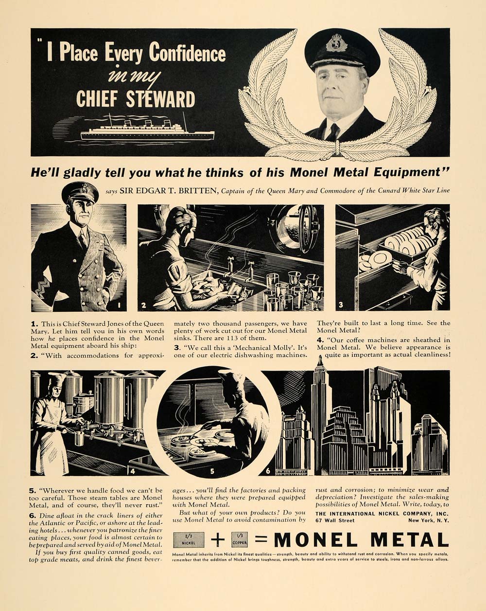 This is an original 1936 black and white print ad for the International Nickel Company, Incorporated, located at 67 Wall Street in New York City, New York. This ad features Chief Steward Jones of the Queen Mary, and Sir Edgar T. Britten, the Captain of the Queen Mary and the Commodore of the Cunard White Star Line.