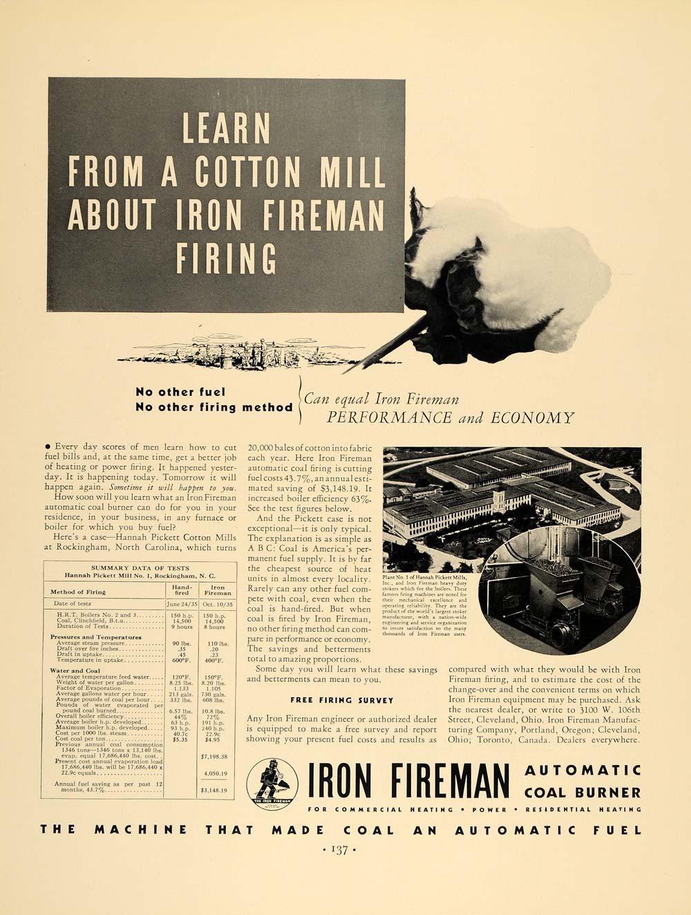 This is an original 1936 black and white print ad for the Iron Fireman Manufacturing Company located in Portland, Oregon; Cleveland, Ohio (3100 W. 106th Street); and Toronto, Canada. This ad features an image of Plant Number 1 of Hannah Pickett Mills, Incorporated, a company that uses the Iron Fireman Automatic Coal Burner for commercial heating, power, and residential heating.