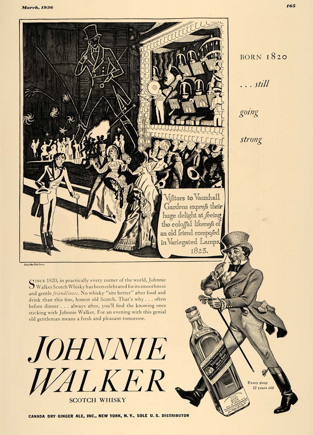 This is an original 1936 black and white print ad for Johnnie Walker Scotch Whisky, a product of Canada Dry Ginger Ale, Inc. in New York City. This particular ad features artwork by Allan Mae Nab Fecit (?) of the visitors of Vauxhall Gardens.