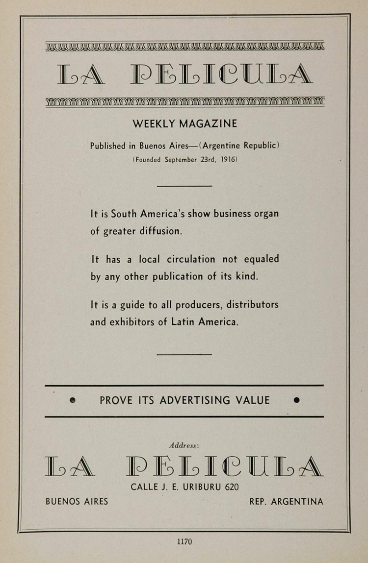 La Pelicula, "a guide to all producers, distributors and exhibitors of Latin America." Published in Buenos Aires, Argentina.