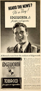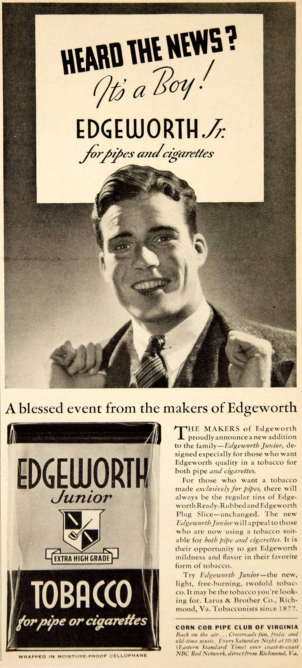 This is an original 1936 black and white print ad for Edgeworth Junior smoking tobacco for pipes or cigarettes that was made and sold by the Larus & Brother Company of Richmond, Virginia (VA).