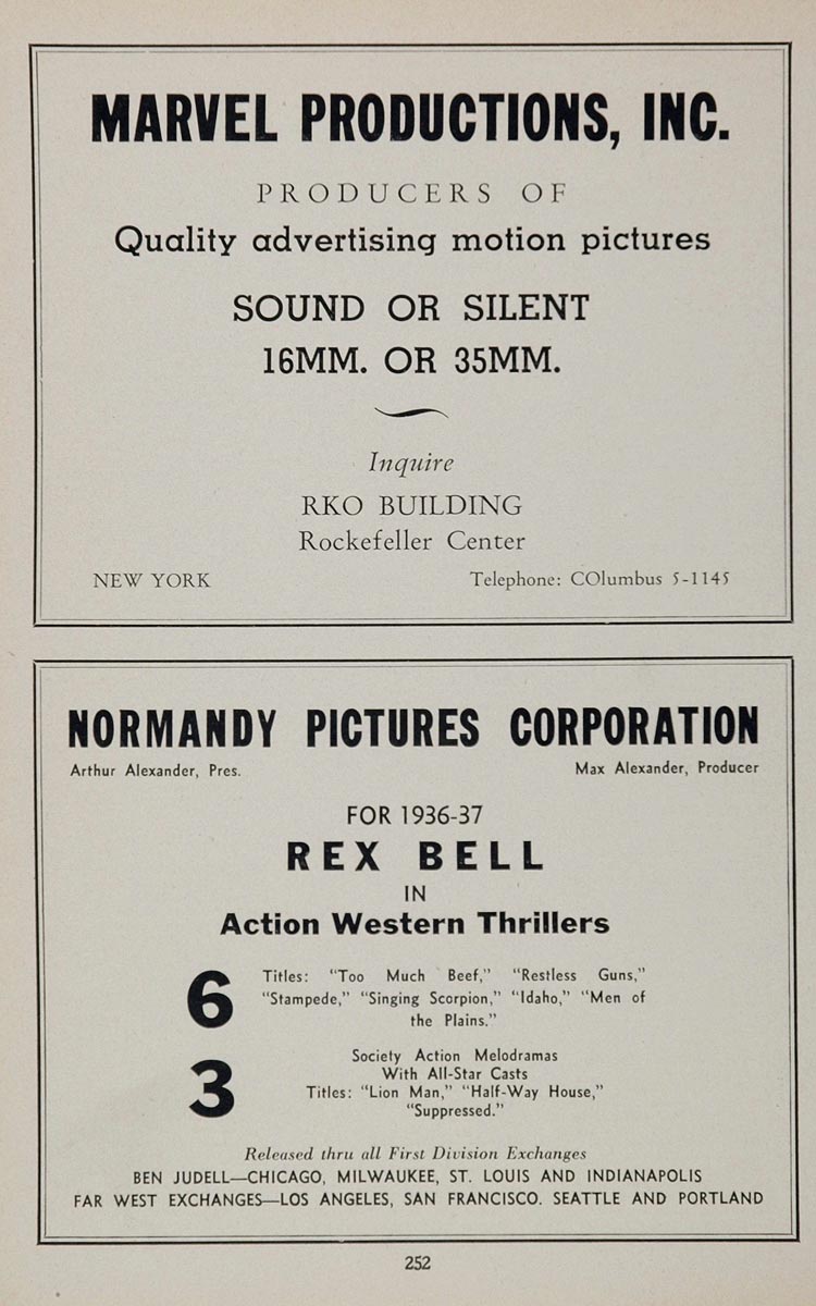 This is an original 1936 black and white print ad for two different companies. The top half of the piece advertises Marvel Productions, Inc., producers of sound or silent 16 MM or 35 MM motion pictures. The bottom half advertises Normandy Pictures Corporation featuring Rex Bell in nine action western thrillers including "Too Much Beef," "Restless Guns," "Stampede," "Singing Scorpion," "Idaho," "Men of the Plains," "Lion Man," "Half-Way Horse," and "Suppressed."