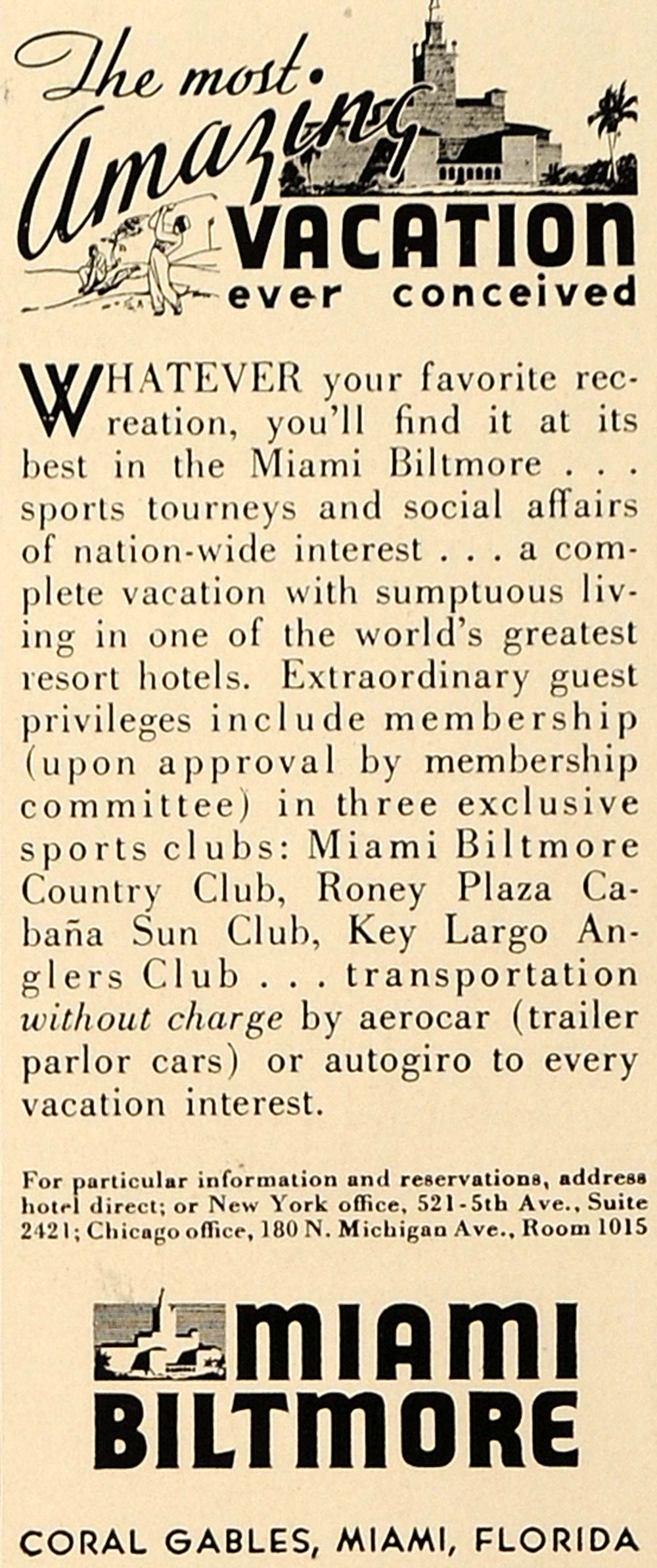 This is a small original 1936 black and white print ad for the Miami Biltmore in Coral Gables, Miami, Florida.